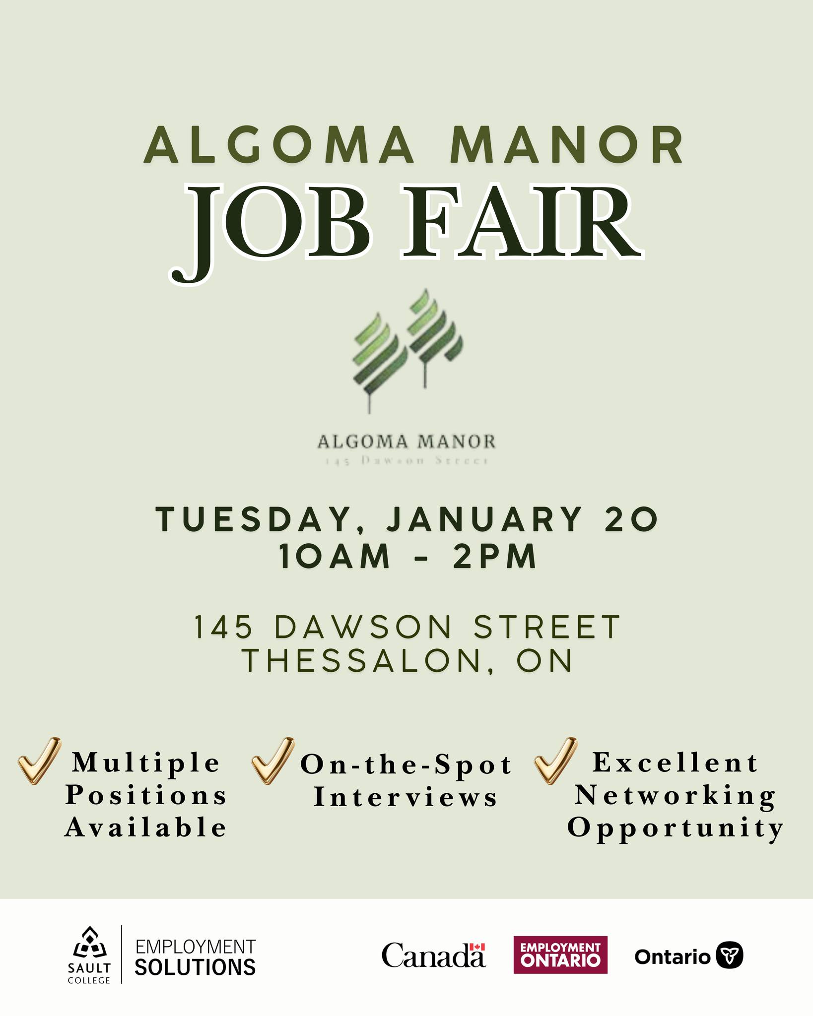 Algoma Manor Nursing Home is hiring for multiple positions and offering on-the-spot interviews. Our team will be on-site to assist and support job seekers throughout the event.